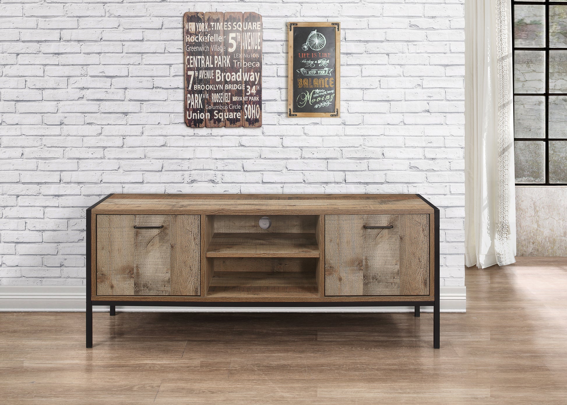 Our Urban range is perfect for adding a hint of industrial chic to any living room. The Urban TV Cabinet features 2 doors making it ideal for storing DVD€™s plus an open compartment for electronic devices. This versatile range is crafted from a metal frame with industrial-effect detail and has a wood-effect finish. Please note the maximum TV weight to be used is 40kg. The maximum recommended size of TV to be used is 48€³. Care instructions: Wipe carefully with a soft, dry cloth.